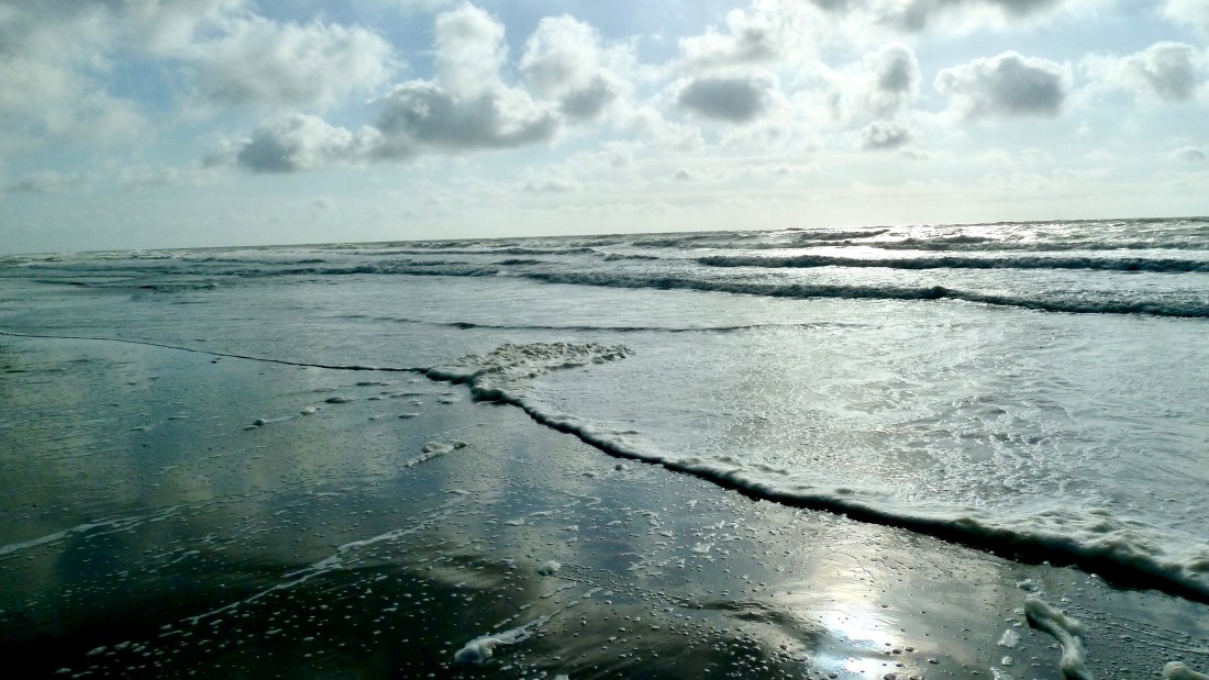 Die Wellen sind an diesem Oktober Morgen besonders hoch. Ein starker Wind treibt sie an den Strand wo sie sich ganz weit auslaufen. Der Meeresschaum legt sich wie Schnee an den Strand. Hin und wieder stieben sie in der Dunkelheit einzeln weiter zu den Dünen als ob sie Schneeflocken wären.